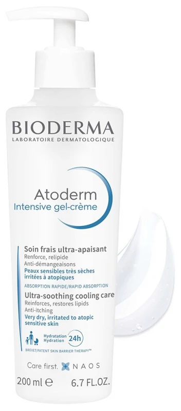 Bioderma Atoderm Ultra-Soothing Cooling Care Intensive Gel-Cream 200 ml is a nourishing anti-itching skin care product with an ultra-light and fresh texture to facilitate its application and absorption by the skin in these conditions. Indeed, heat and/or humidity can make the daily application of a rich care product unpleasant for dry skin with atopic tendency. Thanks to vitamin PP, it restores lipids and reinforces the skin’s barrier on a long-term basis. Formulated with Enoxolone derivative, it soothes itching sensations and reduces the incentive to scratch. The patented Skin Barrier Therapy complex limits the adhesion of certain bacteria (staphylococcus aureus) to the skin surface, which can be the cause of worsening skin dryness. Result: the skin is soothed, moisturized for 24 hours and durably strengthened. It allows immediate dressing and offers a very good tolerance.
