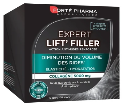 Forté Pharma Expert Lift’Filler Collagen 5000mg 10 Shots is a food supplement with a highly concentrated formula of bioactive collagen to reduce the volume of wrinkles around the eyes and improve skin elasticity.