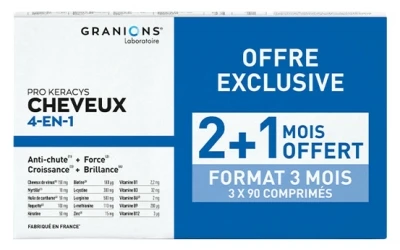 Granions Pro Keracys 4in1 Hair 3 x 90 Tablets including 90 Tablets Free is a food supplement that offers 4 actions to hair: anti-hair loss, strength, growth and brilliance.