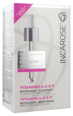 Incarose Pure Solutions Vitamins A C E F 15ml is a concentrated active fluid specially elaborated to delay the skin aging process.