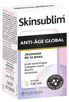 Nutreov Skinsublim Overall Anti-Aging Skin Care 60 Capsules is a dietary supplement whose ingredients work in synergy to maintain skin youthful appearance. It helps plump skin, preserve firmness and promote cell renewal.