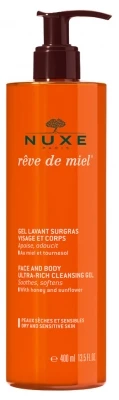 Nuxe Rêve de Miel Ultra-Rich Cleansing Gel 400ml is a face and body shower gel that cleanses, soothes and softens dry and sensitive skin without drying it out. With honey and sunflower, creamy and deliciously honeyed, it takes daily care of dry and sensitive skin respecting the hydrolipidic film.