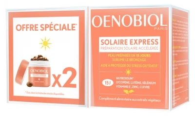 Oenobiol Sun Express 2 x 15 Capsules is a food supplement in form of capsules with vegetable extract (Lycopene, Lutein, Selenium, Vitamin E, Zinc and copper).