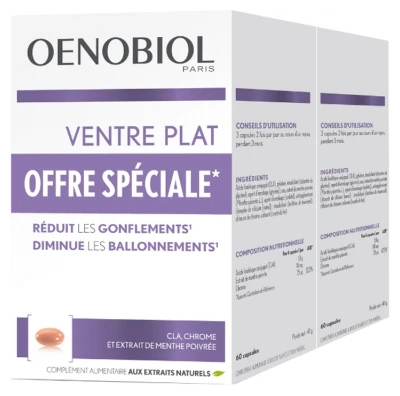 Oenobiol Women 45+ Flat Belly 2 x 60 Gel-Caps is a food supplement in the form of gel-caps based on CLA (conjugated linoleic acid), chromium and peppermint extract, it helps reduce unwanted swelling and bloating for a flatter stomach.