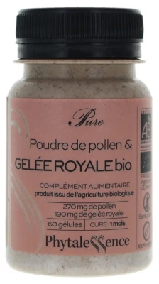 Phytalessence Pure Royal Jelly Pollen Organic 60 Capsules is a food supplement based on royal jelly and pollen powder.