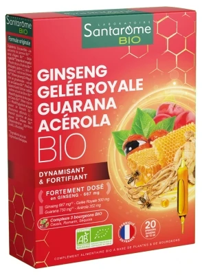 Santarome Bio Organic Ginseng Royal Jelly Guarana Acerola 20 Phials is a food supplement in form of drinkable phial based of Ginseng, Royal Jelly, Guarana and Acerola. Its original formula is composed of: