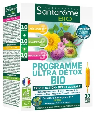 Santarome Organic Ultra Detox Program 30 Vials is a program that promotes the overall detoxification of the body through its triple action. This program is made up of 3 steps which contain :