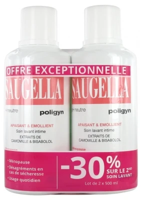 Saugella Poligyn Intimate Cleansing Care 2 x 500ml is a gentle cleansing care with neutral pH specially developed for intimate hygiene contains Chamomile extracts and Bisabolol that helps to relieve the disagreements and itching associated to dryness of vulvar area often present in menopause period or when the vaginal pH is more acid.