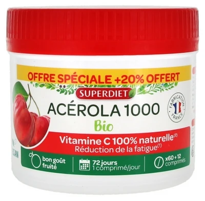 Superdiet Acerola 1000 Organic 60 Breakable Tablets to Crunch + 12 Free Tablets is a food supplement based on Acerola, a red berry selected for its richness in Vitamin C of natural origin that helps to reduce the fatigue.