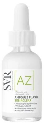 SVR Sebiaclear Flash Vial 30ml is a soothing, anti-reddening, smoothing anti-blemish concentrate for sensitive acne prone skin and/or blemishes, redness, marks.