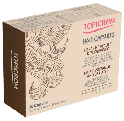Topicrem Hair Capsules Hair Resistance and Beauty 30 Capsules is a food supplement based on Safflower, Argan, Amla, Blueberry, Pantothenic Acid, Vitamin B6 and Copper.