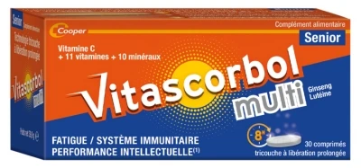 Vitascorbol Multi Senior 30 Tablets is a food supplement that provides you all the essential vitamins and minerals to participate to reduce tiredness, to enhance the intellectual performance and the good functioning of the immune system.