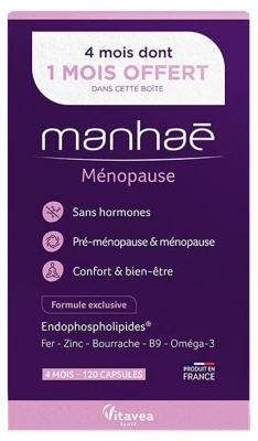 Vitavea Manhaé Menopause 120 Capsules of which 1 Month Free is a food supplement without hormones in form of capsules based on endophospholipid, vitamins, minerals and plant extracts.