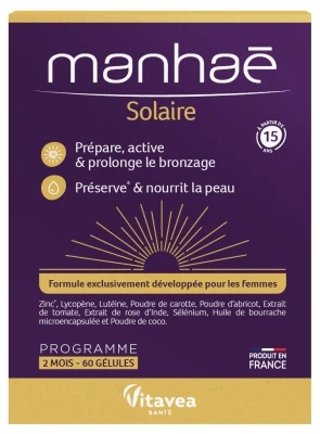 Vitavea Manhaé Sun 60 Capsules is a food supplement for a sublimated and natural tanned complexion while preserving the skin.